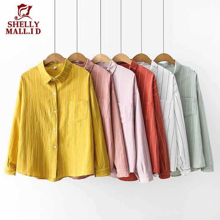 Kemeja Wanita Lengan Panjang Dengan Motif Garis Garis Dan Warna Putih Bergaya Korea Shopee Malaysia