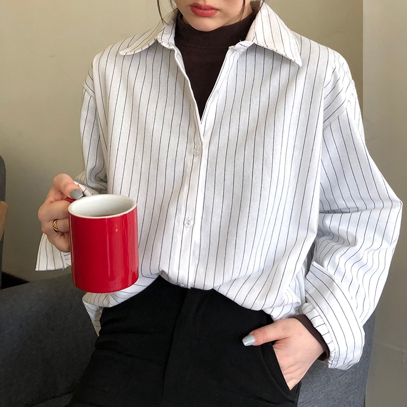 Menolak Kerah Stripe Longgar Lengan Panjang Wanita Korea Kemeja Putih Shopee Singapore