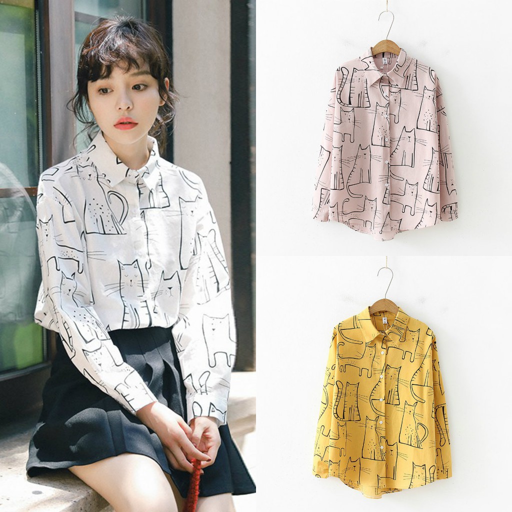 Aimeibeauty S Xl Kemeja Wanita Lengan Panjang Model Longgar Versi Korea Motif Print Shopee Indonesia