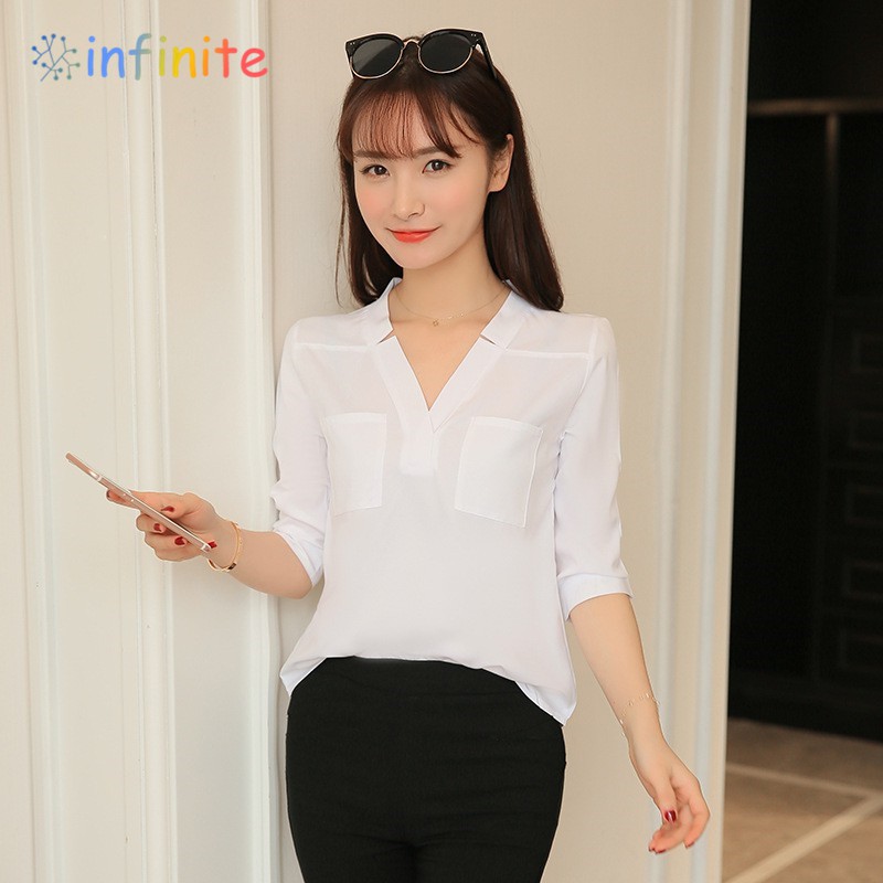 Kemeja Wanita Lengan Panjang Dengan Warna Putih Polos Dan Bergaya Elegan Korea Untuk Kantor Shopee Indonesia